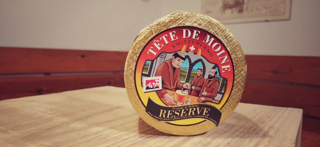 Pare che il nome Tête de moine, ovvero “testa di monaco”, derivi dal caratteristico aspetto che prende questo formaggio nel momento in cui viene raschiato per essere mangiato: assomiglia molto alla tonsura dei monaci, che in veneto si chiama “cerega”. D’altronde il Tête de moine nasce proprio in un monastero nel Giura svizzero, da dove poi si è diffuso nei caseifici della zona.